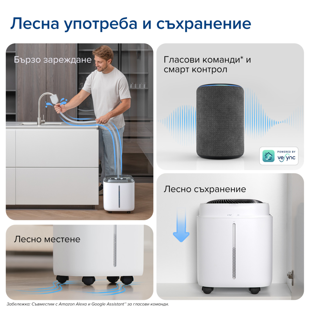 Благодарение на безплатното приложение VeSync, може да управлявате всяка една функция на овлажнителя директно от вашия смартфон. Също така може да използвате гласови команди, като свържете Levoit Superior 6000S с Amazon Alexa или Google Assistant.