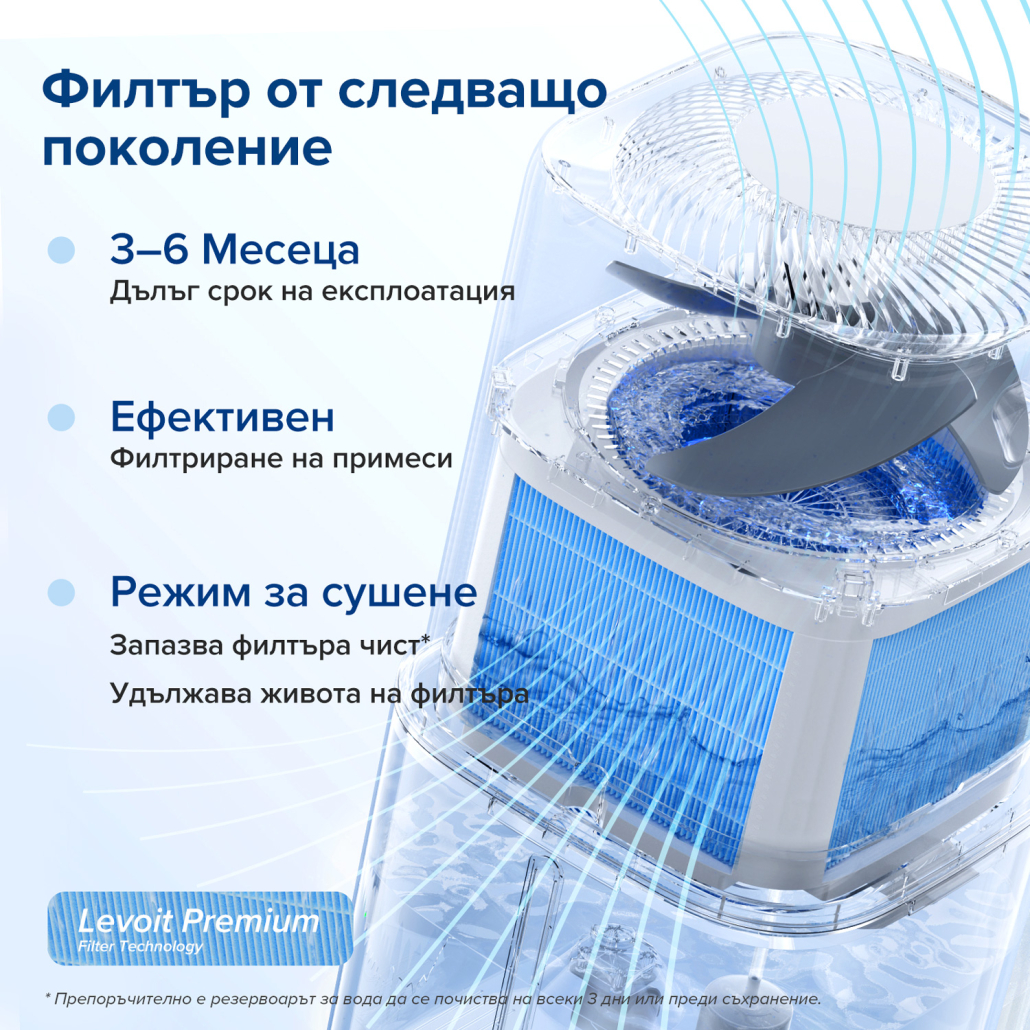 Levoit Superior 6000S е оборудван с високоскоростни лопатки на вентилатора, което ви гарантира ефективното изпарение на водата под формата на фина пара, без видима пара и без следи по мебелите. Подходящ за работа с чешмяна вода.