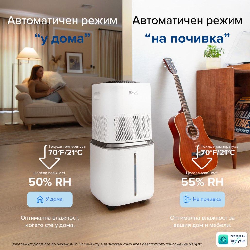 Levoit Superior 6000S разполага с два интелигетни автоматични режима на работа „вкъщи“ и „на почивка“, които се адаптират към различните ви нужди, свързани с влажността в дома ви.